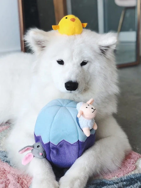 L’Oeuf de PĂąques đŁ et ses 3 petits jouets de Zippy Paws est un vĂ©ritable jouet d’occupation en peluche pour chien. Montrez les petits jouets Ă votre Poilu en pressant sur le squeaker puis cachez les Ă l’intĂ©rieur ! Le couinement permet de stimuler votre chien pendant le jeu.