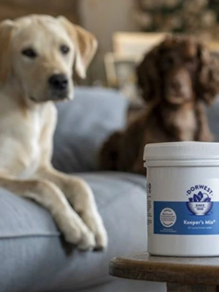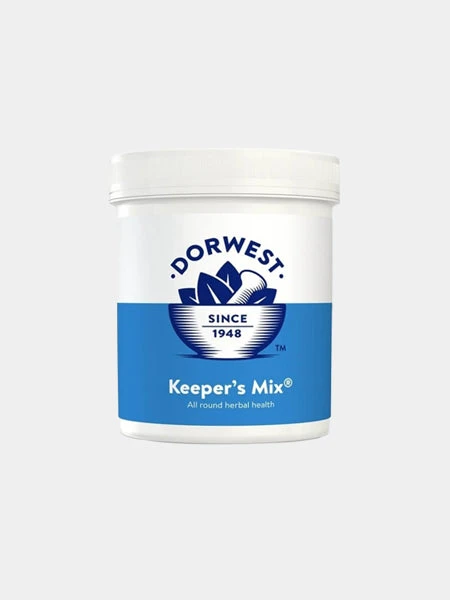 Le complément naturels Keeper’s Mix de Dorwest garde votre chien et votre chat en bonne santé. Les 8 ingrédients utilisés ont un effet tonifiant sur tous les organes principaux. Il favorise un excellent état général de votre chien ou votre chat tout en augmentant leur vitalité. Ce mélange d’herbes naturelles permet également d’améliorer le beauté du poil de votre poilu. Le Keeper’s Mix® contient un mélange de plantes aux vertus bénéfiques comme : le varech riche en minéraux favorise la pousse du poil, les graines de céleri favorisent la souplesse, la luzerne est une source de vitamines A, C, E et K, les orties sont naturellement très riches en vitamine C et en chlorophylle, le romarin soulage les problèmes de digestion, les cosses de psyllium aident le système digestif, la poudre de gratterons permet d’avoir une peau saine et permettent le bon fonctionnement des reins tandis que l’igname de Chine fortifie les intestins